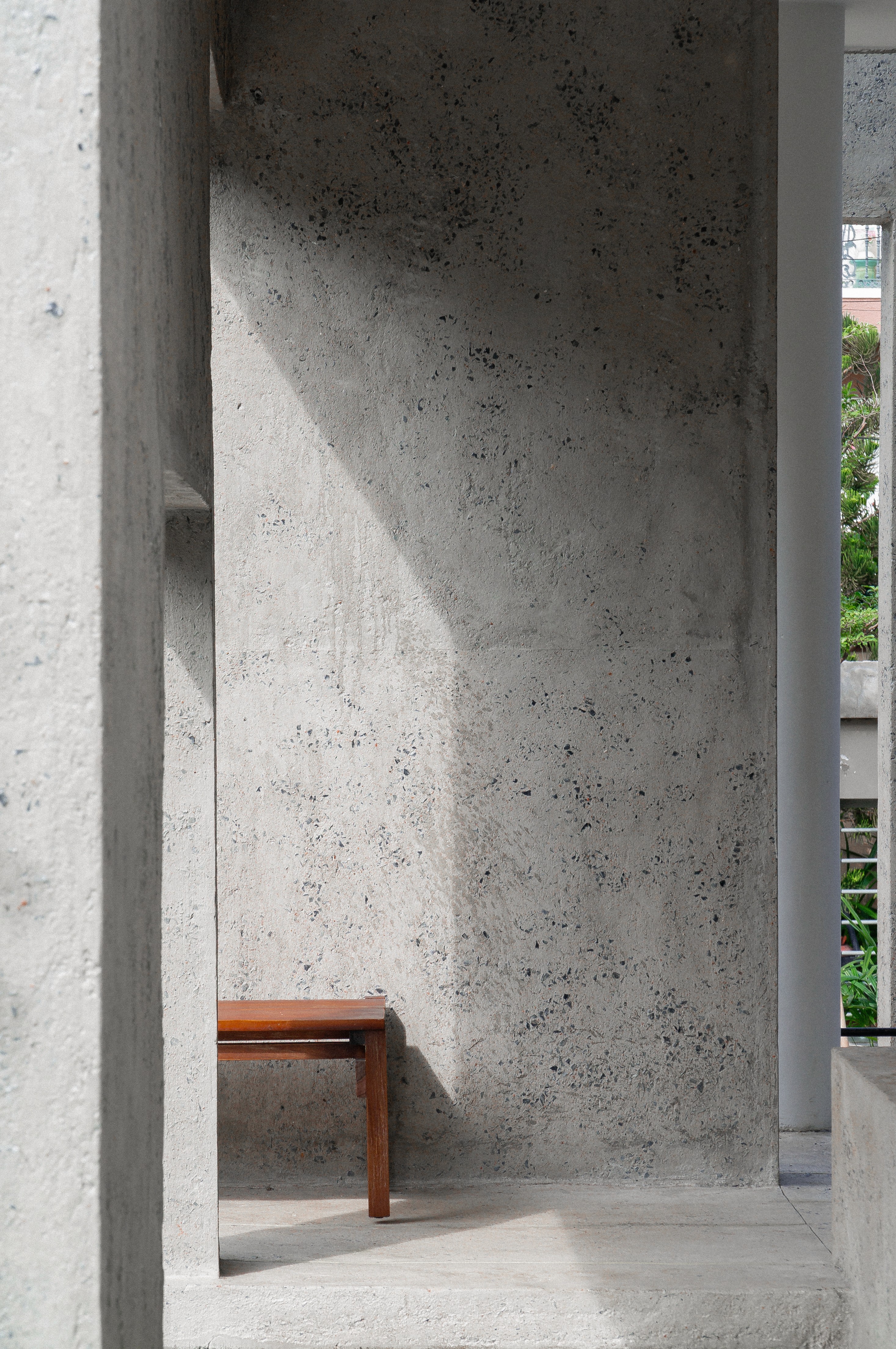 Some columns located at the boundary/threshold of the structure have perfectly served as frames. Their circular sections achieve minimal expression when viewed from various angles, creating a basic abstraction akin to a picture frame. Others have square sections, recessed into the shadows of the building, asserting autonomy through their own shadow and substantial thickness.