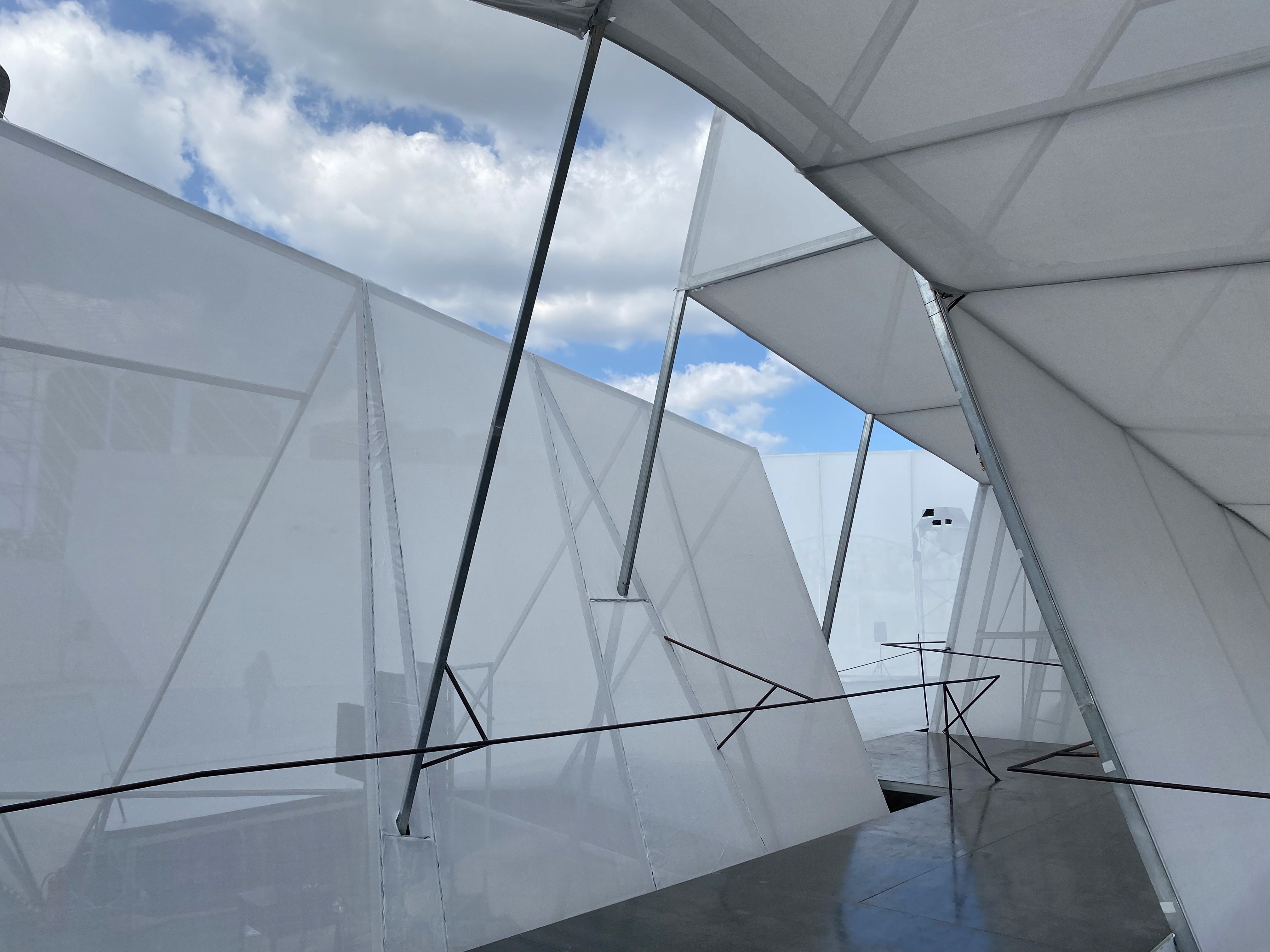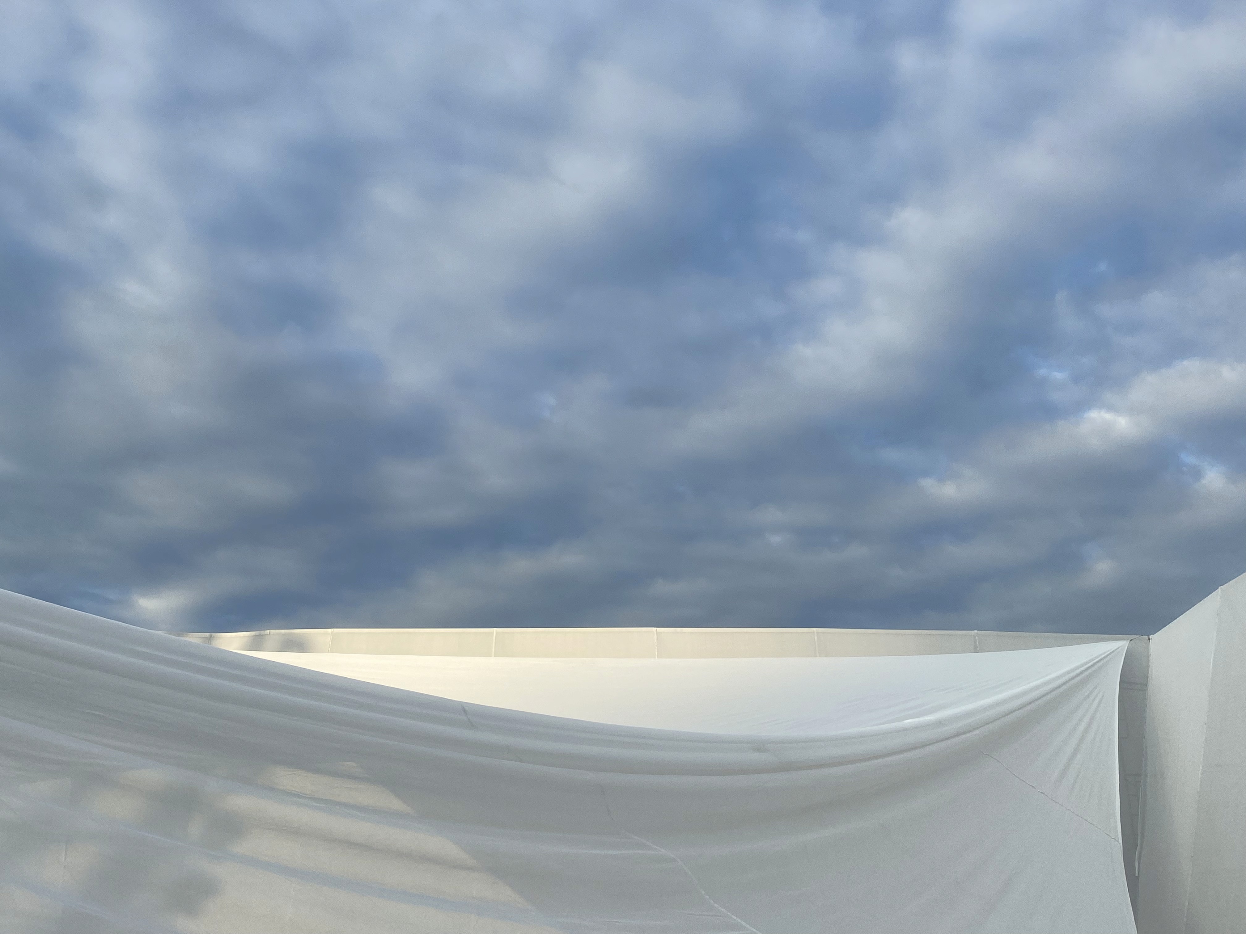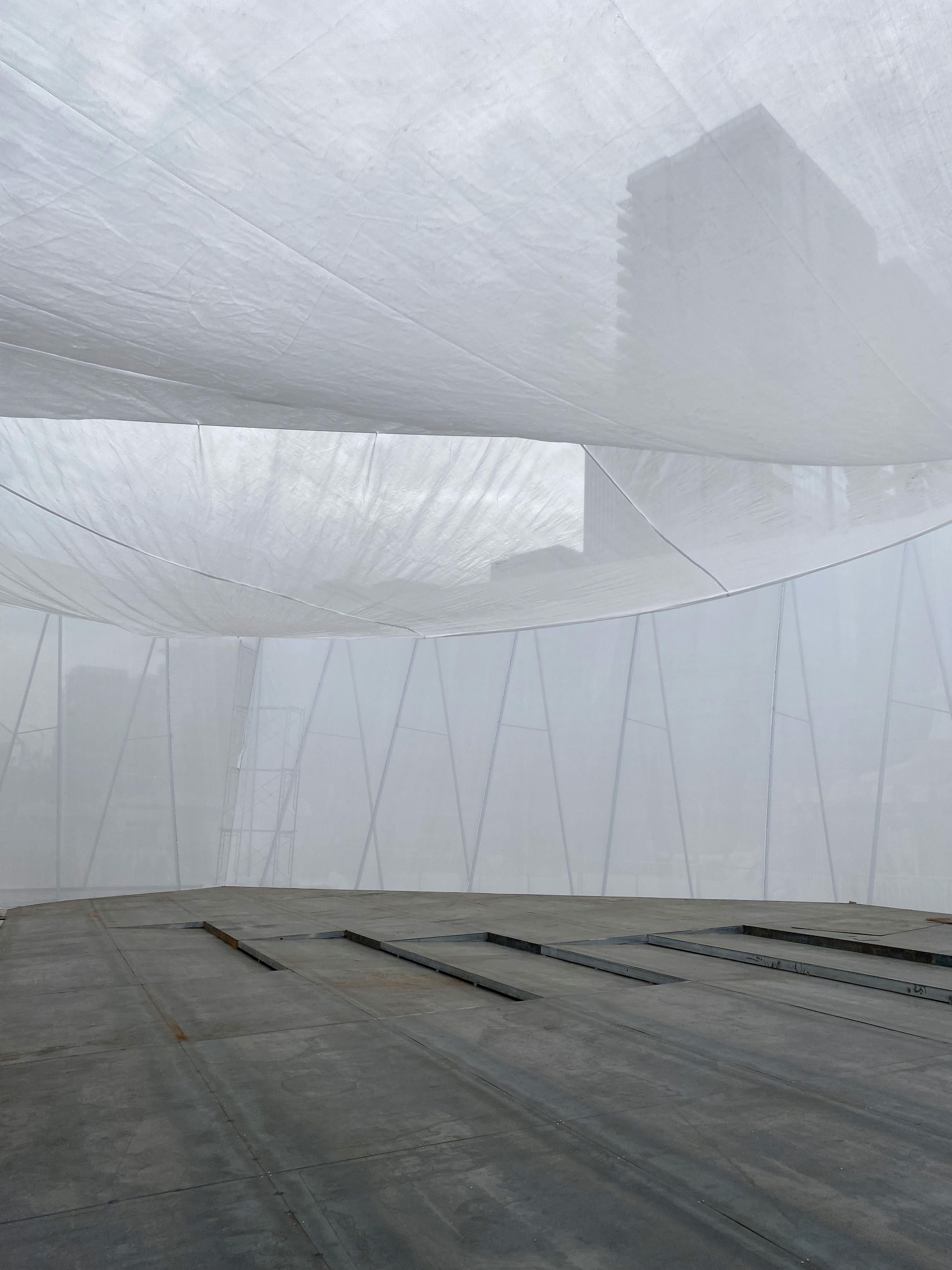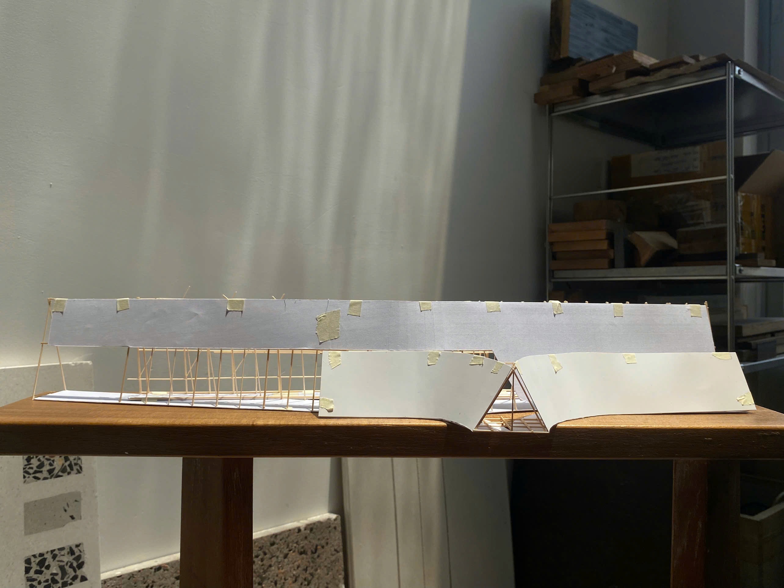 The project is composed of boundaries made as thin as possible, forming an abstract threshold. From the outside, the structure appears detached from its surroundings; yet once inside, visitors quickly sense how the interior world is continually extended through slivers of light, gaps, and movements from the landscape beyond. A fleeting but palpable connection emerges between the interior and exterior—an oscillation where both realms coexist.