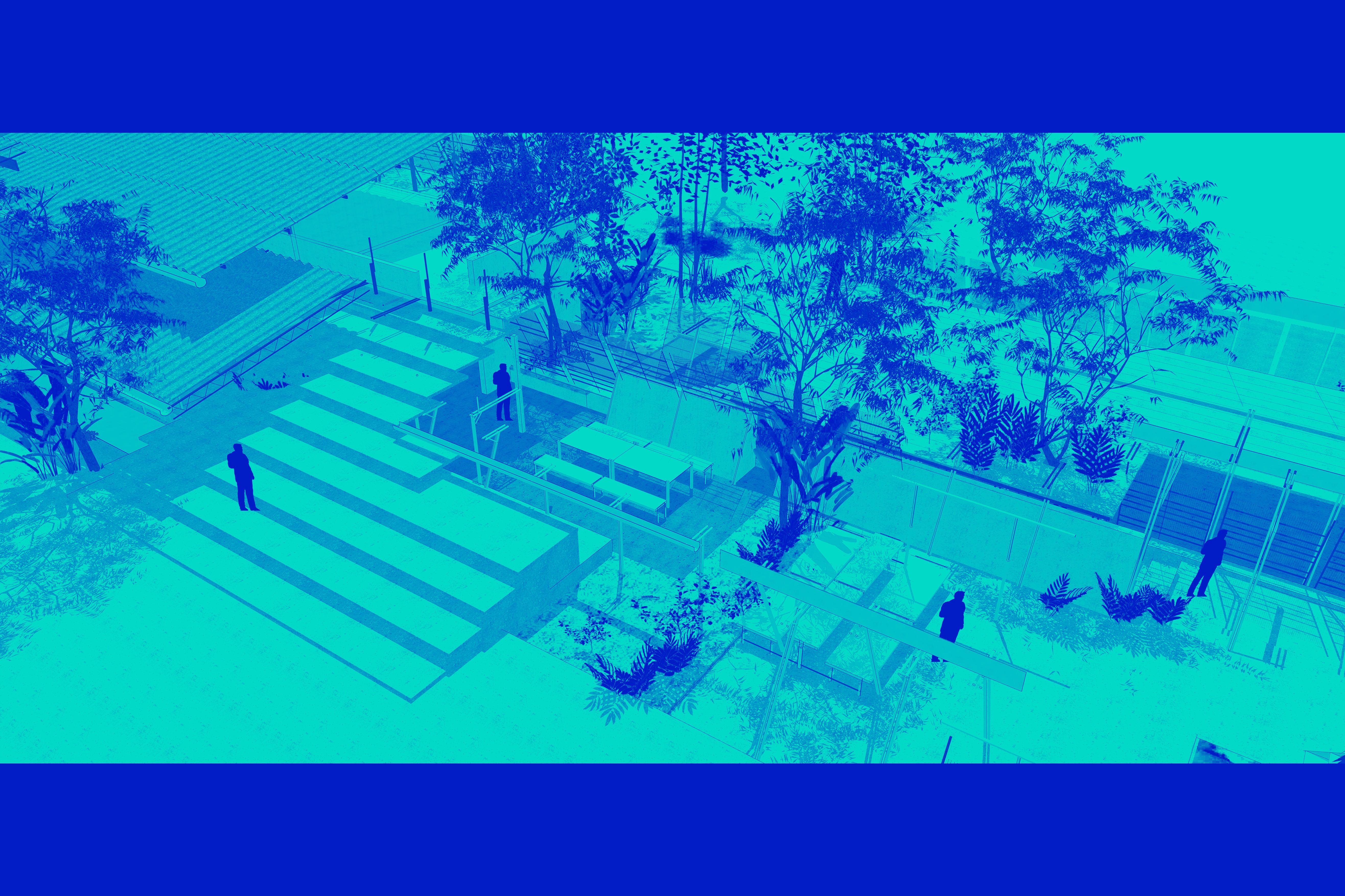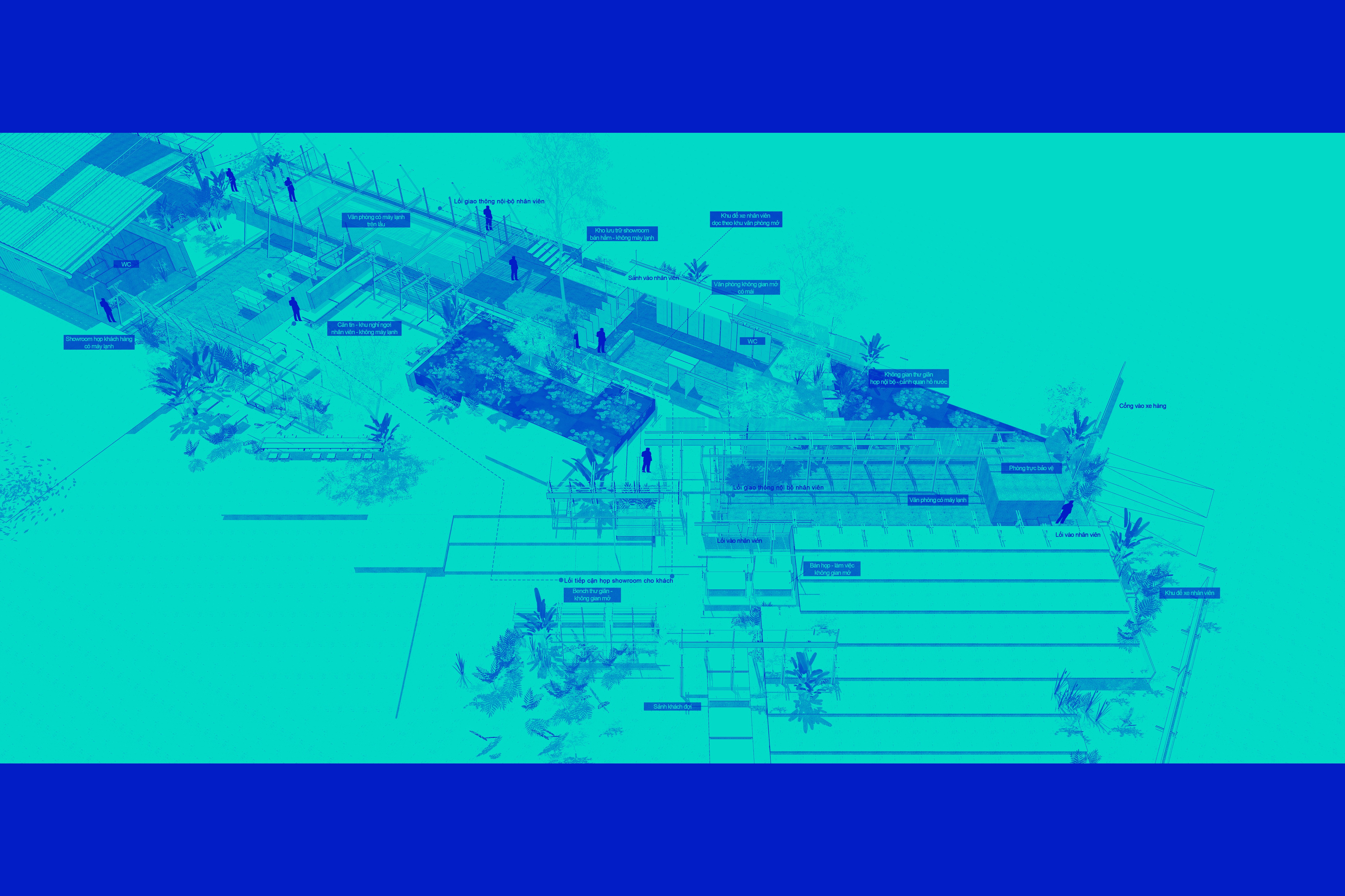 Located in land of rubber - trees planted in grids, the project gives the chance for people to dialogue with this specific context of nature. Described through layers of architecture : main house - boundary between main house and buffer - buffer space - boundary between bufer and outside - outside space; buffer space gives new definition, a variety of experiences, dialogue ways to the outddoor gardens. Buffer zone becomes the main space, where human activities be closer and melt into the rubber forest's shadow. Project insists on the new appearance of buffer's structure, in which the boundary between architecture and nature ingeniously blurred, but at the same time, the richness of tropical environment weaving in architecture is emphasized and clarified.