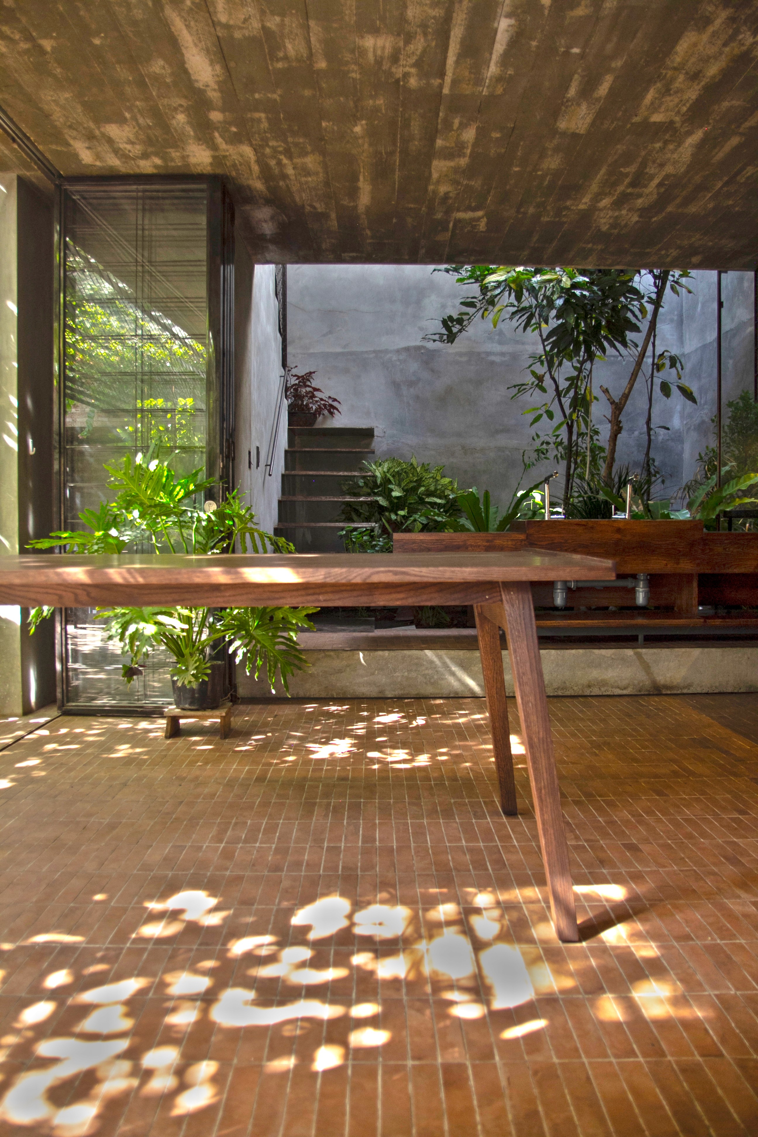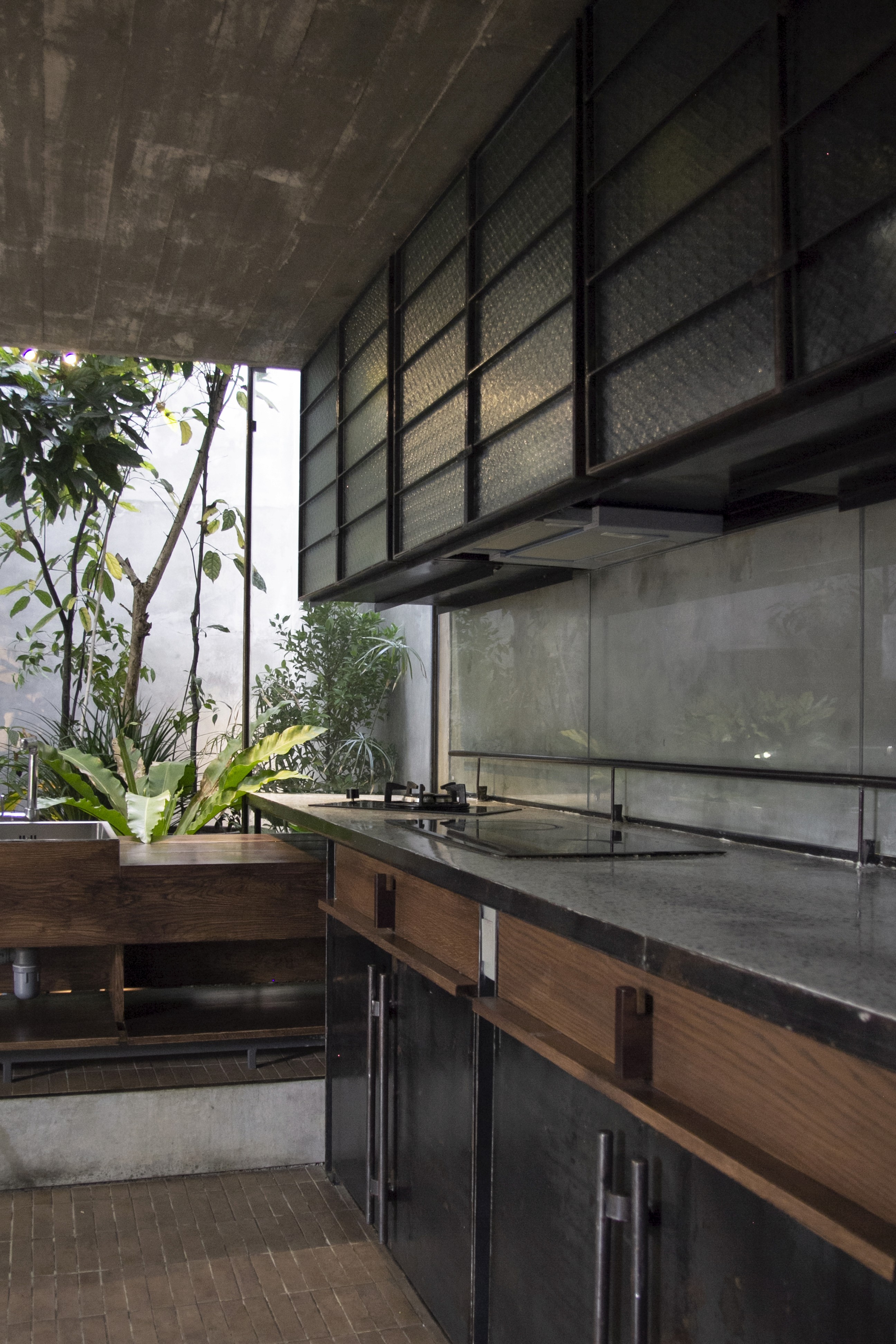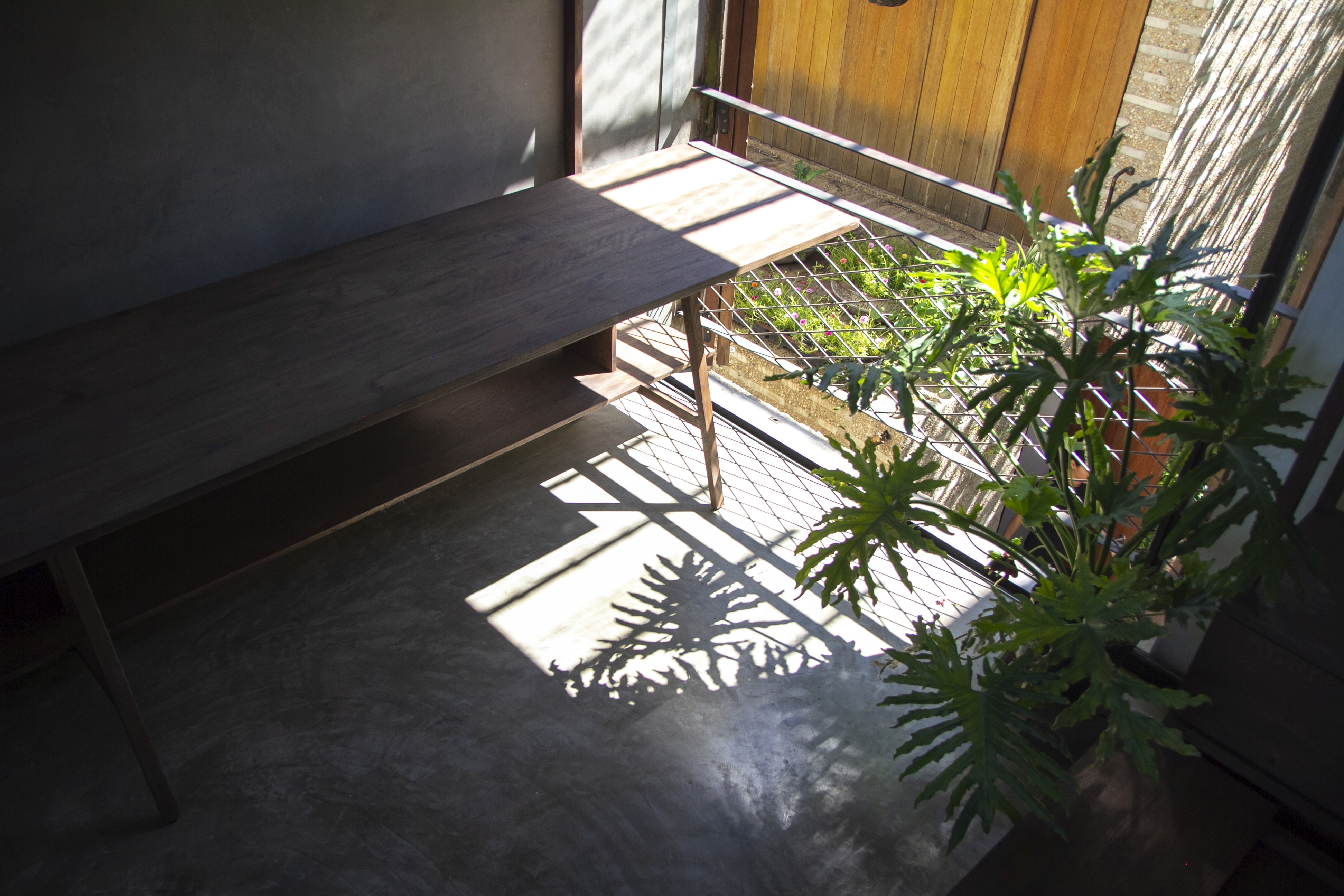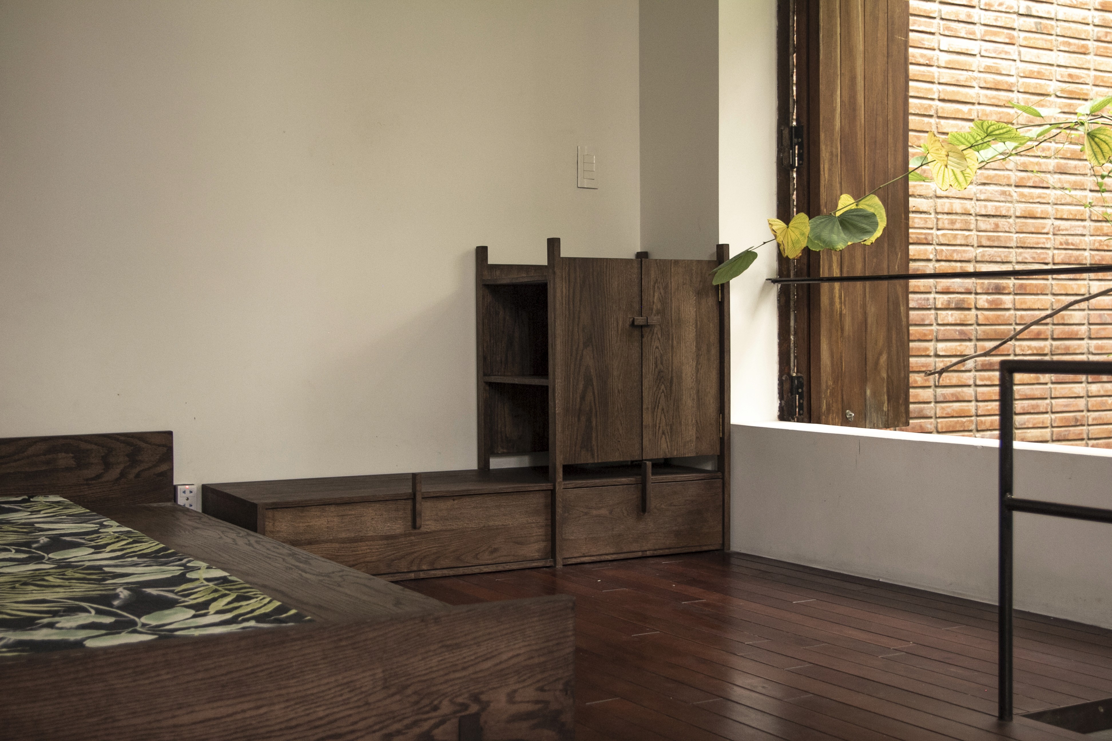 With appreciation to existed house-architecture, we joined the project as furniture designers. Architecture emphasized rough-finishing-materials with washed-concrete volumes composition, which delicatedly decribed movement of sunlight. Furniture's existence in each architectural space also needs to emphasize the scene-frames, that catching the sunlight and the continuity of inside-outside spaces. Honestly describe the framing-structure, keep the mat texture of wood as much natural as the original wood itself is, natural steel texture for doors' fragile frame and kitchen cabinets,… would be the main theme for design. Furniture's appearance in the whole picture, gently melt in rough but lively spirit of existing architecture, then play together with the beautiful walls, sunlight and greenery.